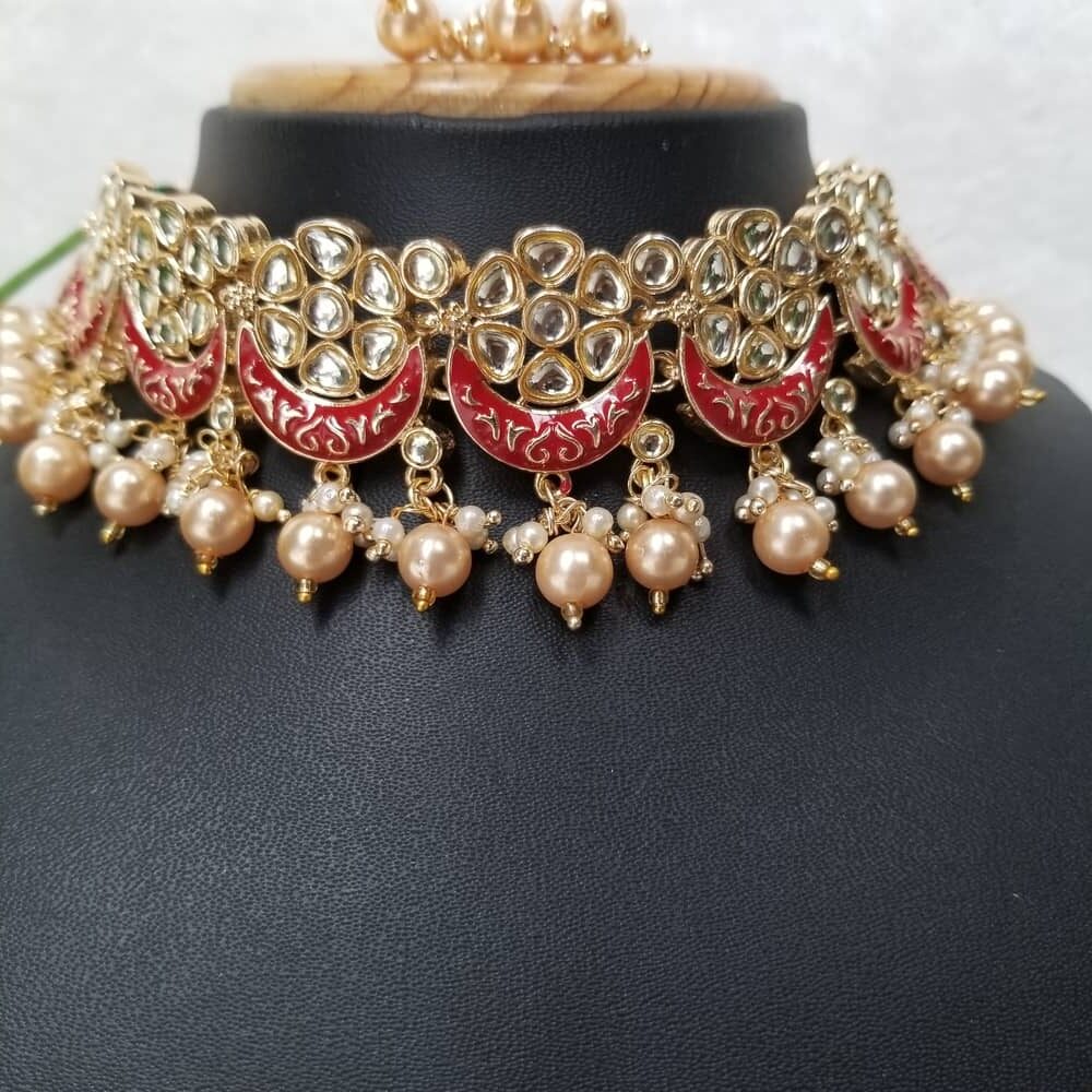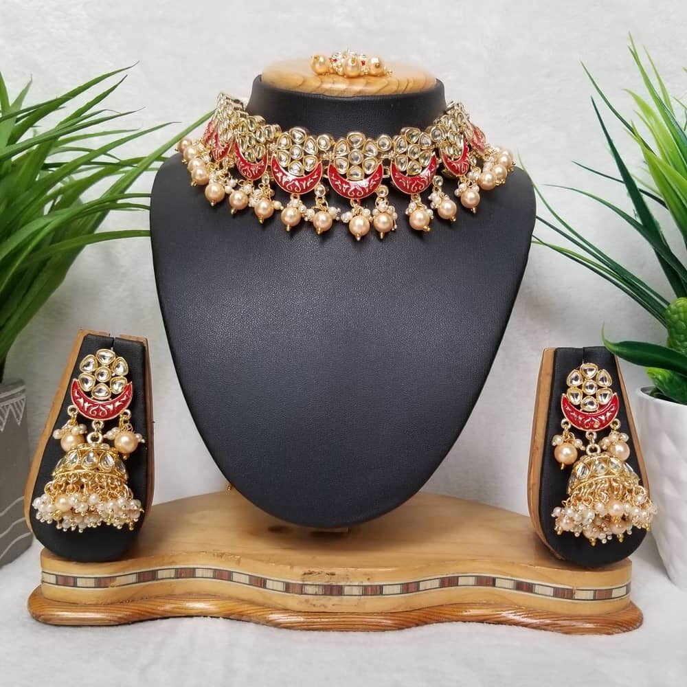 Chandbali Traditional Kundan Gold Plated Necklace Set in Ruby, Free Size