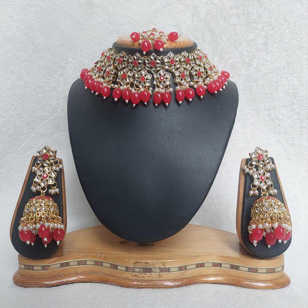 Kundan Choker Necklace Set in Gold finish in Red Color JIA1976